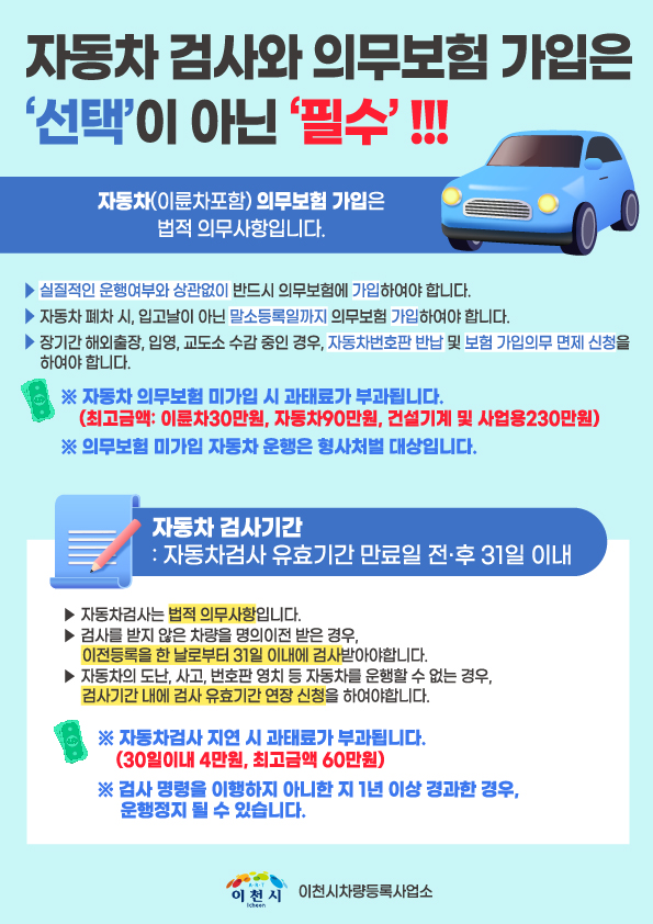 [금요저널] 이천시는 시민들의 안전한 운행을 위해 자동차검사와 의무보험가입은 법적 의무사항임을 강조하며 적극적인 홍보에 나섰다.