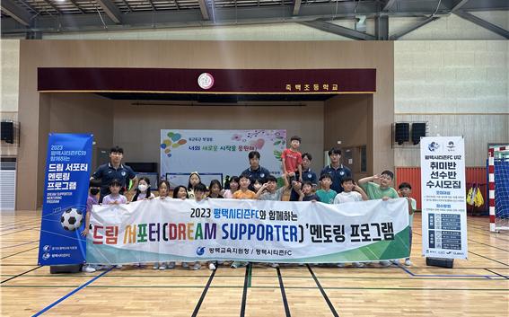 이번 사업은 11월 말까지 신청 학교를 돌며 진행하는 ‘2023 평택시티즌FC와 함께하는 드림 서포터 멘토링 프로그램’으로 선수가 직접 지역 내 학교를 찾아가 축구 클리닉과 팬 사인회 등으로 아이들에게 즐거운 추억을 선사하며 경기도 평택시를 대표하는 스포츠 구단으로서 지역민에게 받은 사랑을 지역사회에 환원하고자 기획됐다.