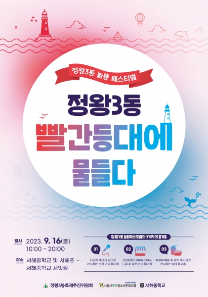 정왕3동 축제추진위원회 관계자는 “정왕3동의 상징물인 빨간등대처럼 열정적이고 모두에게 사랑받는 축제를 준비하고 있다 지역주민들과 청소년 모두 하나되어 축제를 즐겨주시기를 바란다”고 전했다.