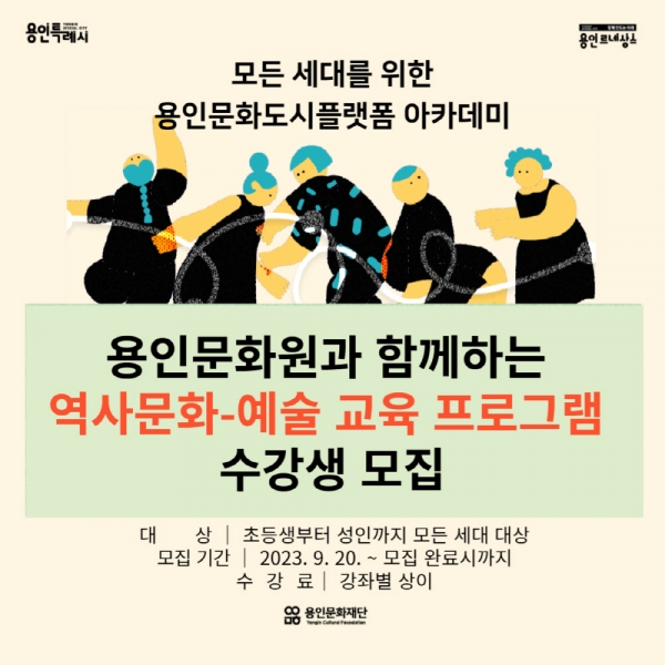용인시민 누구나 전 생애에 걸쳐 양질의 문화예술교육을 누릴 수 있도록 용인문화재단은 다양한 분야의 예술교육 프로그램을 개발해 ‘용인문화도시플랫폼 아카데미’를 운영하고 있다.
