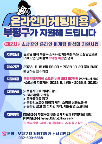 신청 대상은 공고일 현재 부평구에 소재한 소상공업체 중 온라인 마케팅에 50만원 이상의 비용을 지출한 2022년 연매출 3억원 미만 소상공인이다.