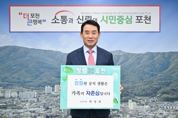 ‘청년다짐 릴레이’의 첫 번째 주자로 나선 백영현 포천시장은 ‘청렴한 공직생활은 가족의 자존심이다’라고 적힌 다짐 문구를 보이며 “공직자의 청렴한 자세와 의식은 세상에서 제일 중요한 공동체인 가족의 자존심과도 같다.
