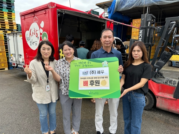 [금요저널] 평택북부장애인복지관은 9월 14일 ㈜세우로부터 다가 오는 추석을 맞이해 경제적 어려움을 겪고 있는 장애인 가정을 위한 배 60상자를 전달받았다.