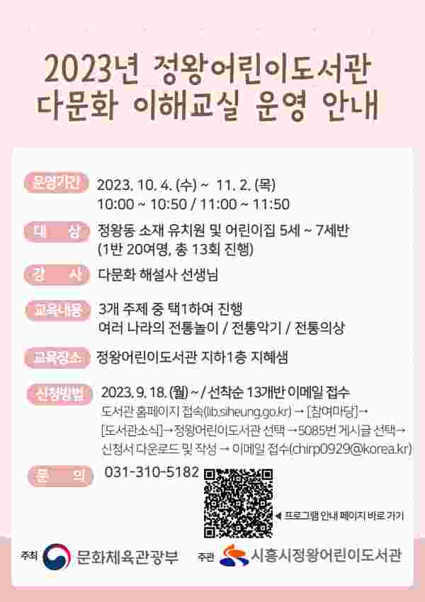 [금요저널] 시흥시 정왕어린이도서관은 관내 유아 교육기관을 대상으로 오는 10월 4일부터 11월 2일까지 매주 4회씩 총 13회에 걸쳐 ‘다문화 이해교실’을 선보인다.