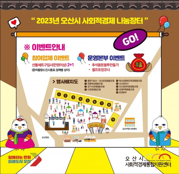 [금요저널] 오산시는 오는 23일 오전 11시부터 오후 6시까지 오산장터 커뮤니티센터 광장 일원에서 오산시 사회적경제기업이 참여하는 ‘추석명절상품전’을 개최한다고 밝혔다.