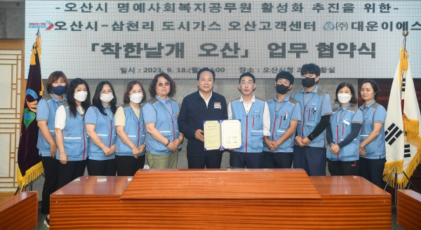 [금요저널] 오산시가‘삼천리 도시가스 오산고객센터 ㈜대운이에스’와 지난 18일 명예사회복지공무원 운영 활성화를 위한‘착한날개 오산’업무 협약식을 개최했다고 밝혔다.