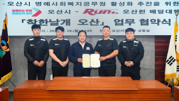 [금요저널] 오산시는 18일 어려운 이웃을 알리고 살피는 명예사회복지공무원 운영 활성화를 위해 오산런 배달대행과 ‘착한날개 오산’업무 협약식 개최했다고 밝혔다.