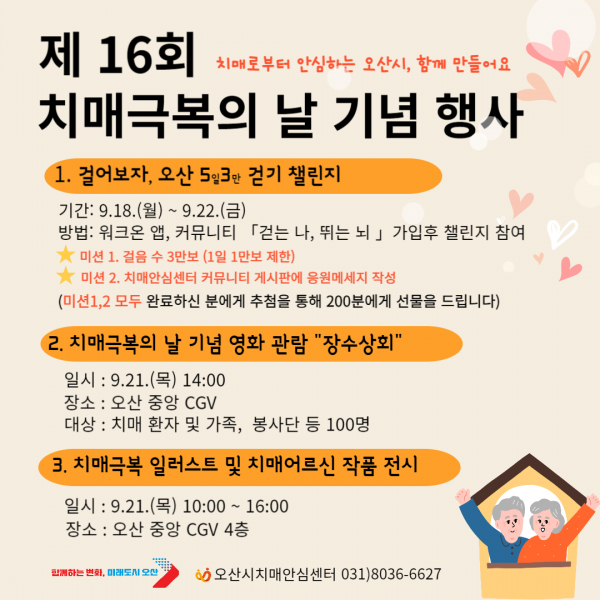 이번 치매 극복의 날 행사는 오산 중앙 CGV에서 치매 극복의 날 기념 영화 관람 치매예방 수칙 3.3.3을 배우고 직접 퀴즈를 풀며 치매 예방수칙 실천을 다짐하는‘함께 해요 치매예방’ 퀴즈 워크온 앱 오산시치매안심센터 커뮤니티 ‘걷는 나 뛰는 뇌’를 활용한 걷기 챌린지 ‘걸어보자, 오산 53’ 기타 페이스북·밴드 등 각종 매체를 활용한 치매예방 홍보 등 다양한 캠페인으로 진행된다.