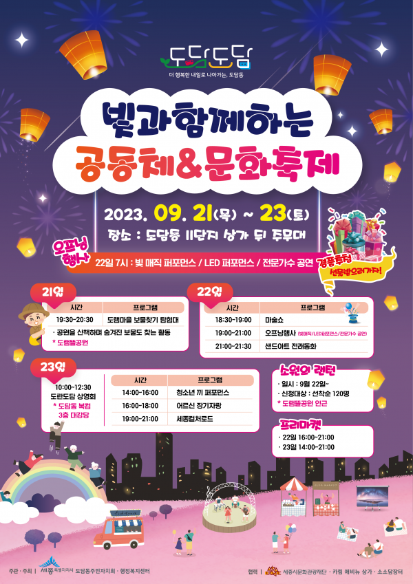 세종특별자치시 도담동 주민자치회와 행정복지센터가 공동으로 개최하는 이번 축제는 첫날인 21일 오후 5시 30분부터 부모와 자녀가 한 팀을 이뤄 진행하는 ‘도램마을 보물찾기 탐험대’로 문을 연다.