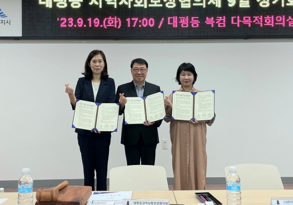 지난 19일 대평동 행정복지센터에서 대평동지역사회보장협의체, ㈔한국장애인의사소통개발원과 위기에 놓인 이웃을 찾아 지원하는데 상호 협력할 것을 약속하는 업무협약을 체결했다(사진=세종시)