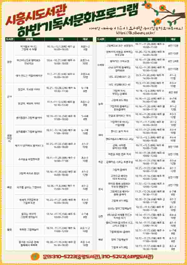 [금요저널] 시흥시 도서관은 책 읽기 좋은 계절인 가을을 맞아 시민의 풍요로운 독서문화 생활을 지원해줄 하반기 독서문화 프로그램을 오는 10월 4일부터 운영한다.