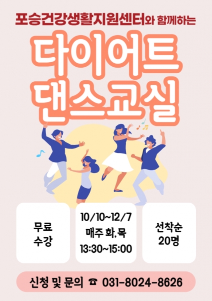현재 다이어트에 관심있는 지역주민을 대상으로 ‘뱃살제로 다이어트 댄스교실’ 참여자를 모집 중이며 선착순 20명까지 접수한다.