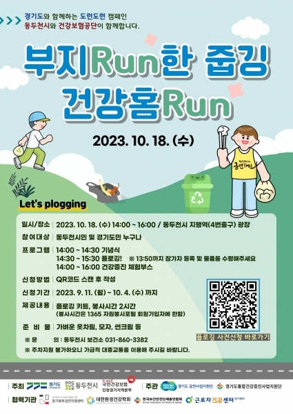 [금요저널] 동두천시 보건소는 오는 10월 18일 동두천시 지행역 일대에서 열리는 “부지Run한 줍깅 건강홈Run” 캠페인에 참가할 시민을 모집한다.