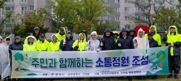 [금요저널] 평택시 송탄출장소에서는 지난 20일 고덕동 파밀리에 아파트 마을공동체인 모아모아행복방 단원들과 고덕동 행복정원단이 중심이 되어 녹지공간 내에 장미터널과 계절초화류 등을 심어 소통정원을 만들었다.