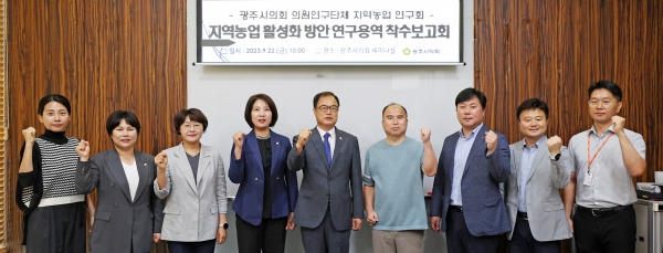 [금요저널] 광주시의회 의원연구단체인 ‘지역농업 연구회’는 22일 광주시의회 세미나실에서 연구단체 소속 의원과 관련 기관 전문가 등 10여명이 참석한 가운데 ‘지역농업 활성화 방안 연구용역’ 착수보고회를 개최했다.