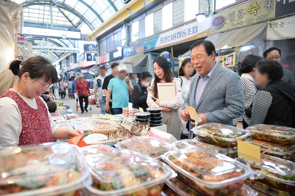 최민호 시장은 이날 세종전통시장에서 농수산물, 과일 등을 구입하고 시장을 찾은 시민들과 명절 인사를 나눴다.