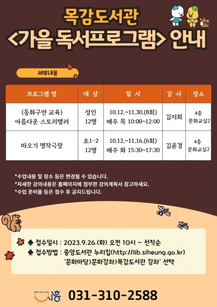 [금요저널] 시흥시 목감도서관은 10월부터 11월까지 2개월간 ‘가을 독서프로그램’을 운영한다.