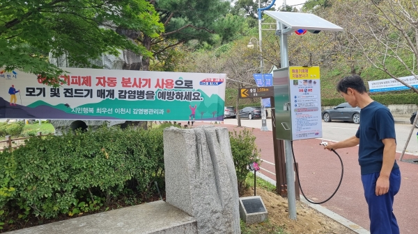 [금요저널] 이천시는 코로나19 4급 감염병 전환 및 2단계 조치 시행으로 야외 활동이 증가함에 따라 모기 및 진드기 매개 감염병 예방을 위해 시민들이 자주 이용하는 공원 및 산책로 등에 해충기피제 자동 분사기를 25일 설치했다고 밝혔다.