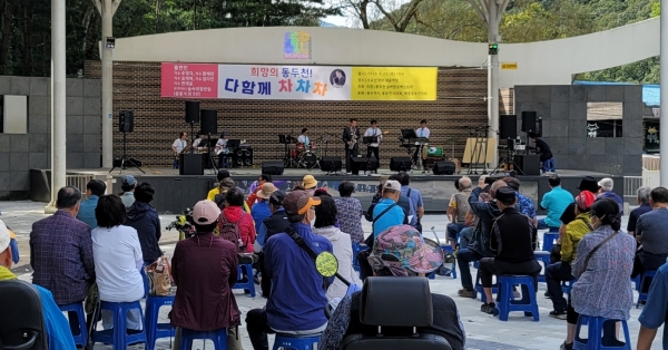 [금요저널] 지난 23일 소요산 야외무대에서 동두천 실버팝오케스트라는 ‘희망의 동두천 다 함께 차차차’공연을 펼쳤다.