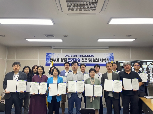 [금요저널] 재단법인 용인시청소년미래재단은 26일 청렴한 조직문화 조성과 재단의 핵심가치인 소통, 배려, 도전, 변화를 추구하는 윤리경영 실천을 위한 ‘반부패·청렴 윤리경영 선포 및 실천 서약식’을 개최했다.