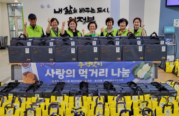 [금요저널] 의정부시 송산3동행정복지센터는 9월 26일 다가오는 추석을 맞이해 송산3동 지역사회보장협의체와 함께 관내 독거노인 100가구에 명절 선물세트를 전달했다고 밝혔다.