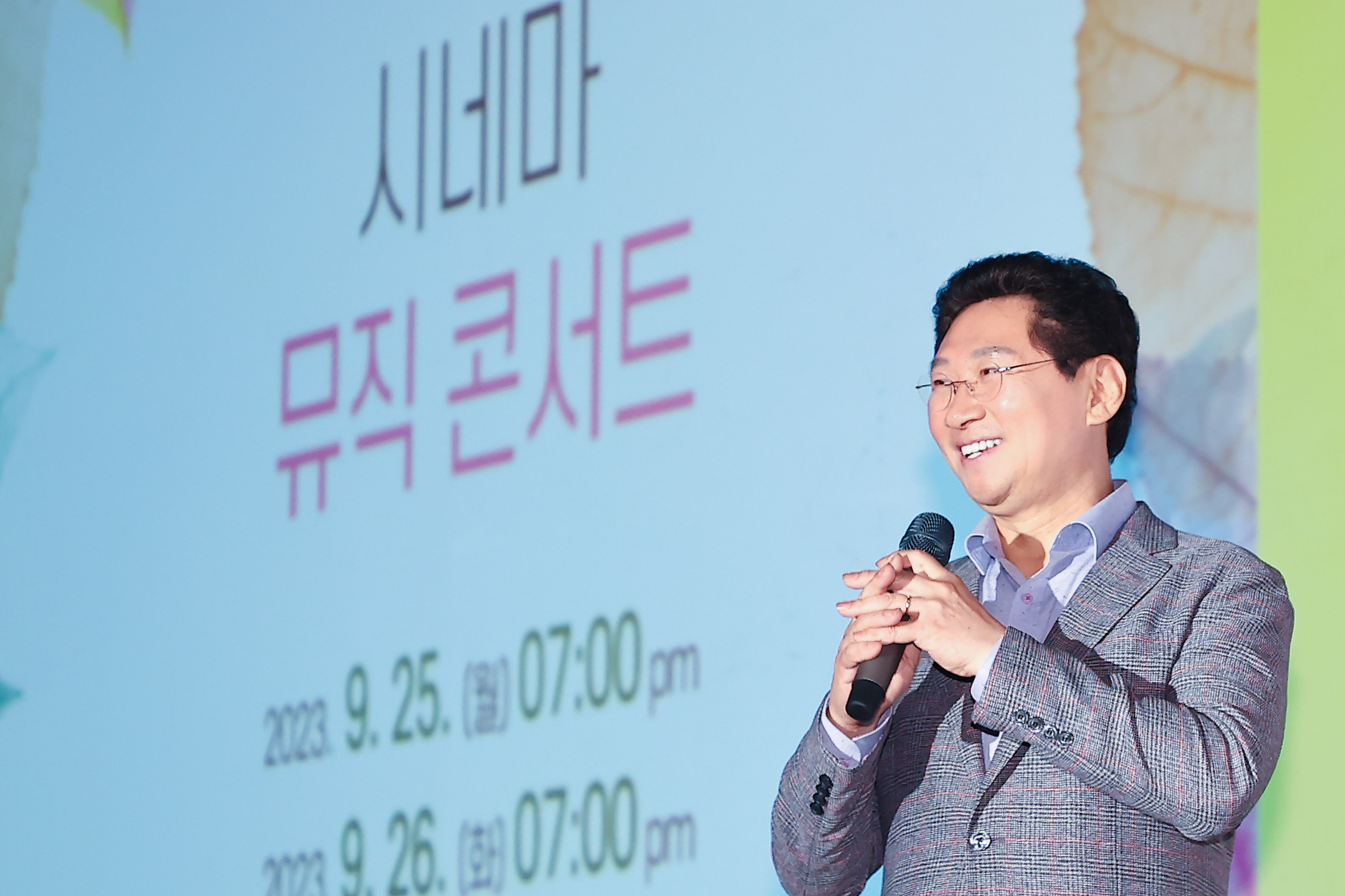 이상일 용인특례시장이 추석 연휴를 앞둔 지난 27일 저녁 기흥구 동백동 동백호수공원에서 열린 ‘2023 영화산책 시네마뮤직 콘서트’에서 깜짝 게스트로 등장해 뮤지컬과 영화 ‘오페라의 유령’에 나오는 ‘All I Ask Of You’를 소프라노 정찬희씨와 함께 불렀다.