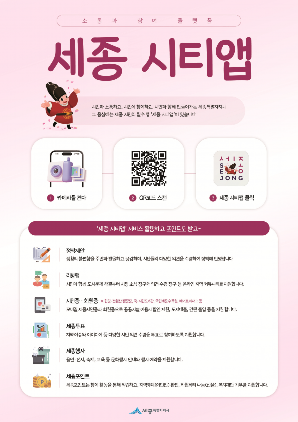 이중현 지능형도시과장은 “세종 시티앱은 지역의 다양한 소식과 행사를 쉽고 편리하게 접할 수 있는 소통과 참여 플랫폼”이라며 “이번 세종축제와 연계한 이벤트를 통해 세종포인트도 듬뿍 지원해 드리니, 시민 여러분의 적극적인 참여를 부탁드린다”고 말했다.