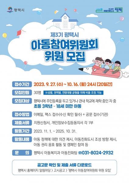[금요저널] 평택시가 오는 16일까지 아동의 참여권 증진 및 안정적인 아동친화도시 조성을 위해 ‘제3기 평택시 아동참여위원회’ 위원을 공개 모집한다.