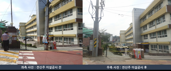 이런 전신주를 기존 초등학교 통행로에서 3m 가량 떨어진 곳으로 이동시켰다.