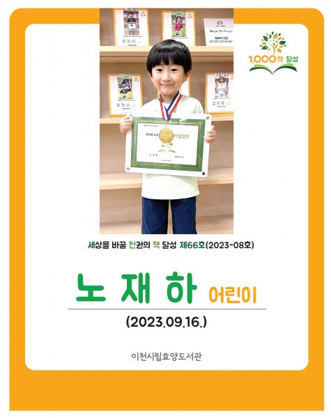 세천책과 함께하며 아이와 함께한 도서관 나들이는 잊지 못할 추억이 됐다는 66호 세천책 달성의 주인공 노재하 어린이 부모님은 “1,000권 읽기를 달성할 수 있을까 의문이 들었지만 달성스티커들을 붙이며 같이 좋아하고 뿌듯해졌다”, “시간을 내 도서관이라는 공간을 방문해 책냄새를 맡으며 소리 내어 읽고 듣는 것이 굉장히 의미 있고 귀한 시간이였다”는 프로그램 참여 후기를 남겨줬다.