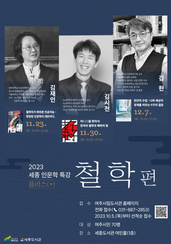[금요저널] 여주시는 오는 11월 넷째 주 목요일부터 12월 첫째 주 목요일까지 세종도서관 여민홀에서 ‘세종 인문학 특강 플러스’ ‘철학 편’을 운영한다.