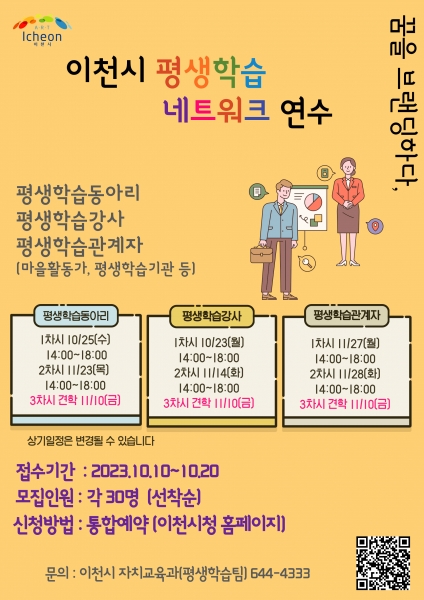 [금요저널] 이천시는 지속가능한 평생학습도시 이천의 네트워크 구축을 위한 평생학습 강사, 동아리, 평생학습기관 등을 대상으로 역량강화 연수를 위해 10월 20일까지 수강생을 모집한다.