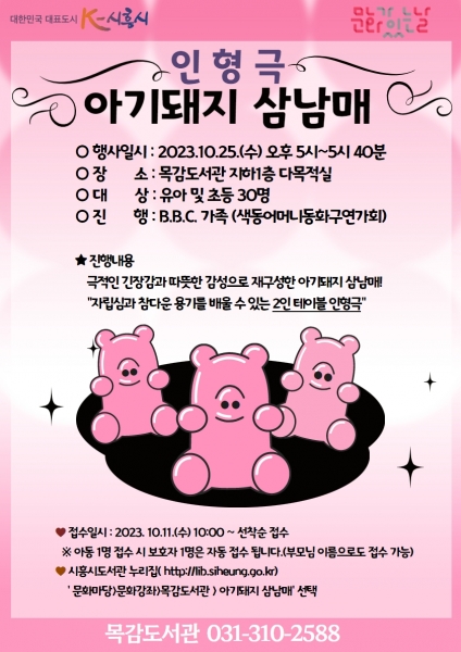 [금요저널] 시흥시 목감도서관이 오는 10월 25일 오후 5시에 인형극 ‘아기돼지 삼남매’를 상연한다.