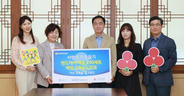 [금요저널] 가수 진욱은 지난 11일 평택시청 2층 대외협력실에서 핸드케어 제품 290세트와 백미 10㎏ 120포를 평택행복나눔본부에 전달했다.