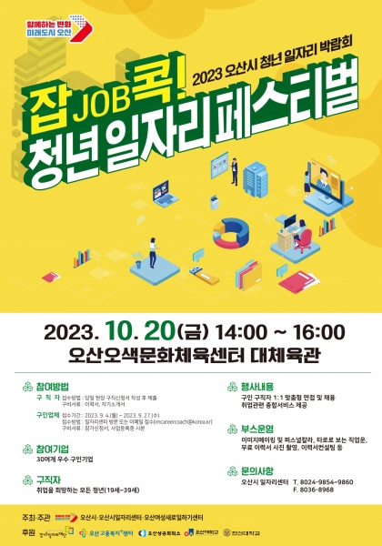 [금요저널] 오산시는 오는 20일 오산오색문화체육센터 대체육관에서 2023년 오산시 청년 일자리 박람회 ‘잡job콕 청년 일자리 페스티벌’을 개최한다고 밝혔다.