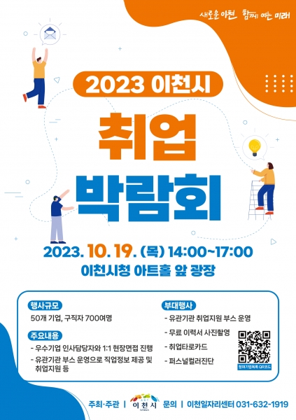 [금요저널] 이천시는 기업의 맞춤형 인재 채용과 구직 시민의 폭넓은 취업기회 제공을 위해 오는 10월 19일 오후 2시부터 5시까지 이천시청 아트홀 앞 모두의 광장에서 ‘2023 이천시 취업박람회’를 개최한다.