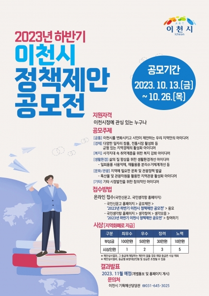 시 관계자는 “이번 ‘2023년 하반기 이천시 정책 제안 공모전’을 통해 시민들의 다양하고 창의적인 제안을 발굴하고 시정에 적극 반영함으로써 행정서비스의 질적 향상과 시민과 함께 소통하는 열린 행정이 실현되도록 노력하겠다”고 말했다.