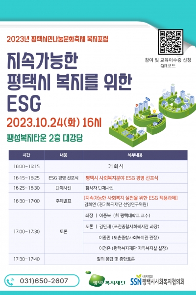 [금요저널] 평택복지재단과 평택시사회복지협의회는 2023년 평택시민나눔문화축제 복지포럼으로 10월 24일 오후 4시에 팽성복지타운에서 사회복지시설 기관 및 유관기관, 시민들을 초청해 ‘지속가능한 평택시 복지를 위한 ESG’를 개최한다고 밝혔다.