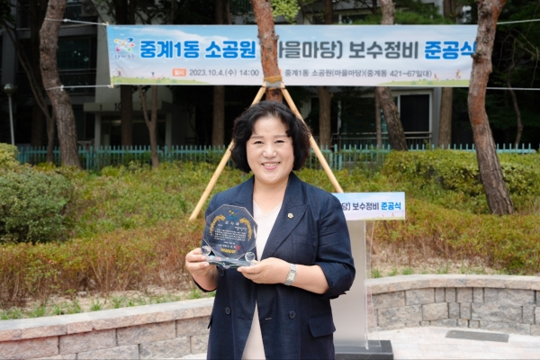 [금요저널] 서울특별시의회 환경수자원위원회 봉양순 위원장이 10월 4일 중계1동 소공원에서 열린 노후 마을마당 보수정비 준공 행사에서 노원구청으로부터 ‘감사패’를 수여 받았다.