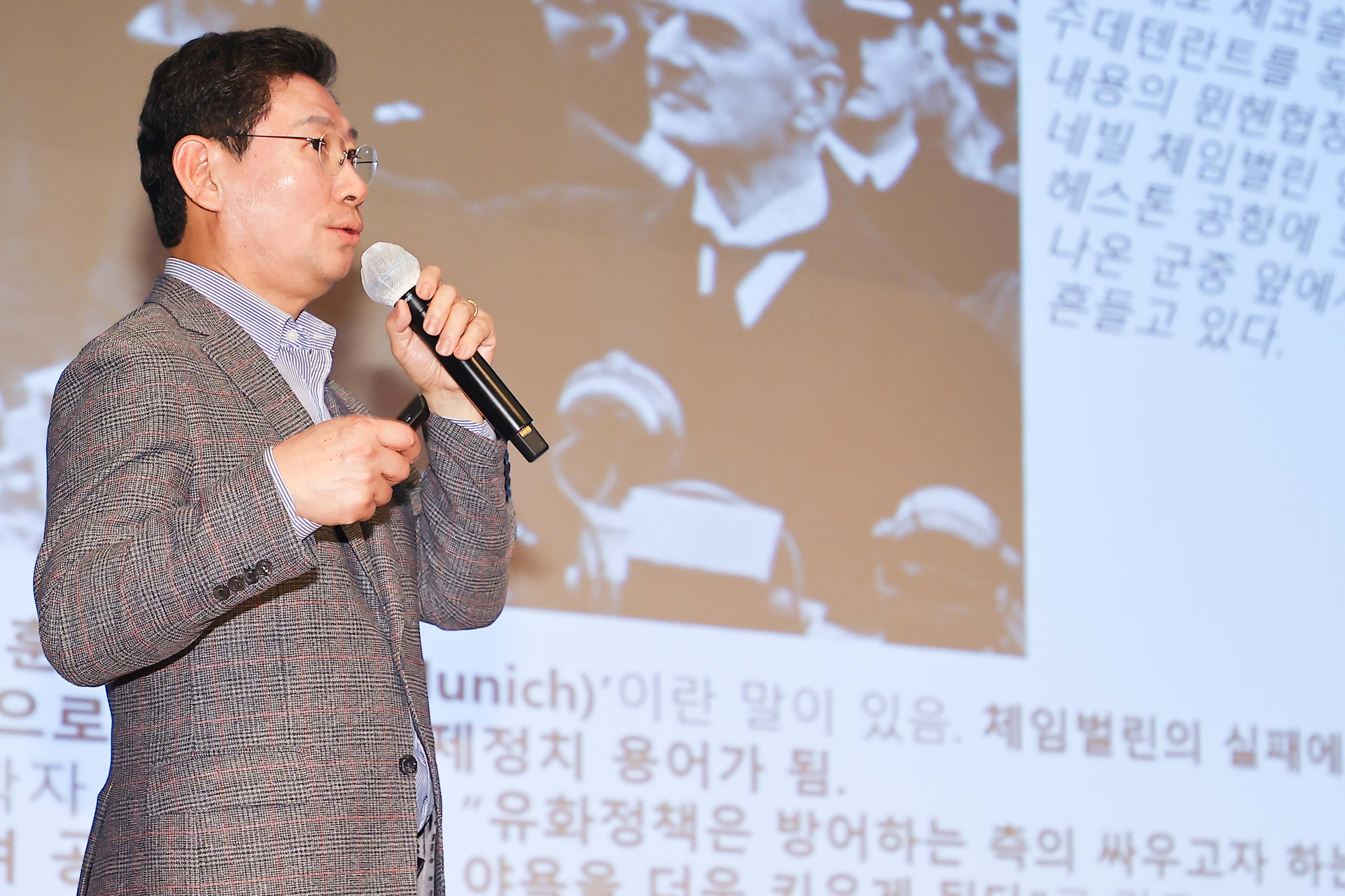 이 시장은 1938년 히틀러의 흉계를 간파하지 못하고 위장평화 공세에 넘어가 히틀러에게 전쟁 준비의 시간을 줬던 뮌헨협정의 주역 네빌 체임벌린 영국 총리의 유약한 리더십을 설명하면서 "전쟁을 무서워한 나머지 적의 위장평화 공세에 속아서 나약한 유화정책을 폈던 결과는 2차 세계대전의 참화로 이어졌다"면서 뮌헨협정(1938년 9월)의 교훈은 오늘의 우리에게도 유효하다고 강조했다.
