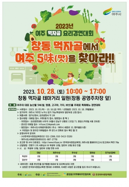 [금요저널] 여주시는 10월 28일 창동 먹자골 테마거리 일원에서 중앙동2지역 도시재생예비사업 일환으로 ‘2023년 여주 먹자골 요리경연대회’ 행사를 개최한다고 밝혔다.