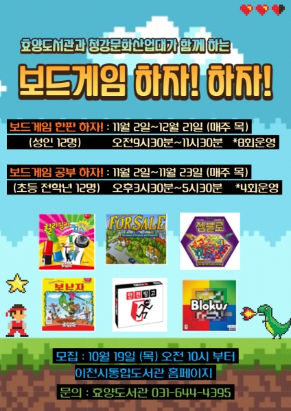[금요저널] 이천시 효양도서관은 오는 11월 2일부터 초등학생과 성인을 대상으로 ‘보드게임 하자 하자’ 프로그램을 운영한다.