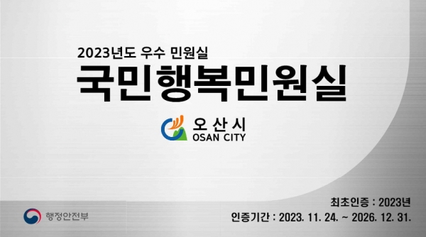 [금요저널] 오산시는 행정안전부가 주관하는‘2023년 국민행복민원실’에 도내 유일하게 신규 인증기관으로 선정됐다고 지난 17일 밝혔다.