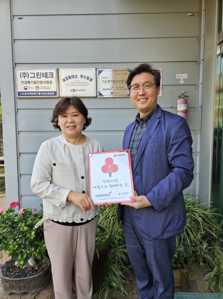 ㈜그린테크 전정애 대표는 “더불어 사는 지역사회에 함께하는 일원으로써 조금이나마 도움이 되고자 착한기업에 가입하게 됐다”며 “착한기업을 통해 이웃들을 위한 따뜻한 손길이 모여 큰 사랑으로 전해지길 바란다”고 전했다.