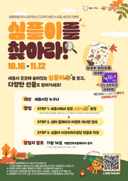 [금요저널] 세종특별자치시 광역정신건강복지센터가 정신건강사업에 대한 시민 접근성을 높이기 위해 누리집을 새로 단장하고 이를 기념한 ‘심플이를 찾아라’ 이벤트를 다음 달 10일까지 진행한다.