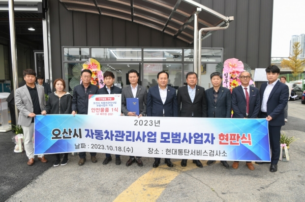 [금요저널] 오산시는 지난 18일 오산종합정비센터와 현대동탄서비스검사소에서 2023년 오산시 자동차관리사업 모범사업자 현판식을 개최했다.