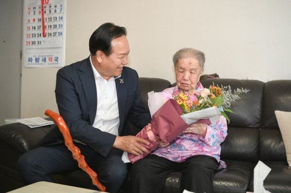 [금요저널] 오산시는 지난 18일 제27회 노인의 날과 10월 경로의 달을 맞아 올해 100세를 맞이한 장수 어르신 가정을 방문해 청려장과 대통령 축하 카드를 전달했다고 밝혔다.