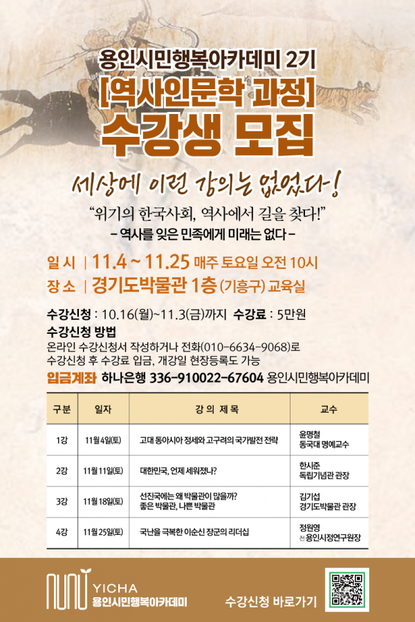 [금요저널] 용인시민행복아카데미는 11월 4일부터 "위기의 한국사회, 역사에서 길을 찾다"라는 주제로 ‘역사인문학과정’을 개설하고 수강생을 모집한다고 밝혔다.