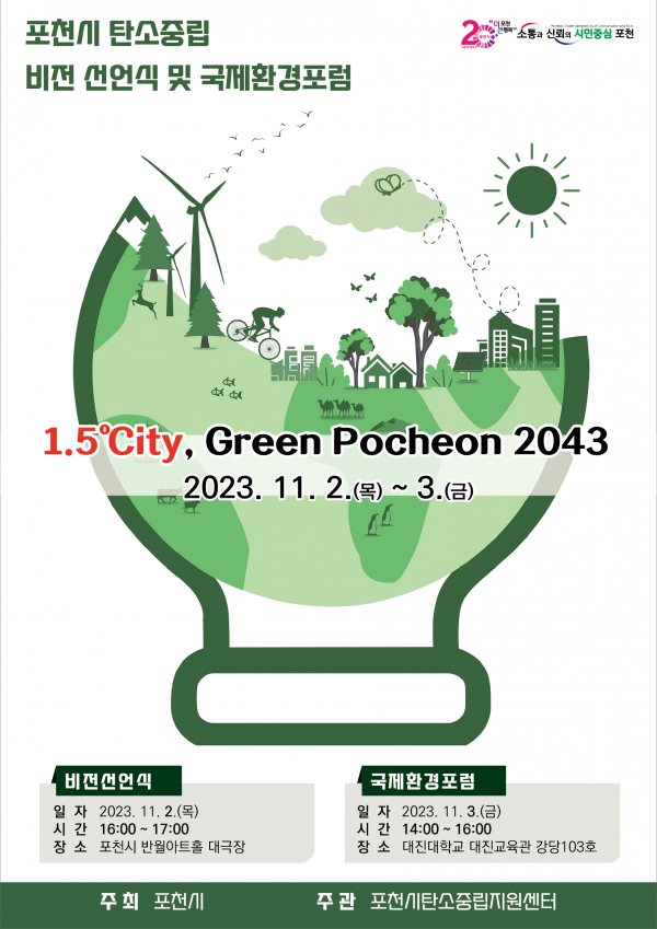 탄소중립 비전 선언식과 국제환경포럼은 지난 ‘대한민국 지방정부 기후적응 선언’에 동참에 따라 ‘1.5℃ity, Green Pocheon 2043’ 비전 슬로건으로 마련됐다.