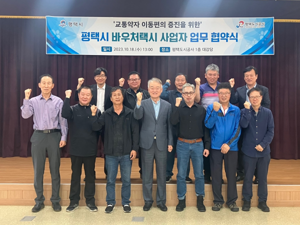 평택도시공사는 10월 18일 평택도시공사 대강당에서 강팔문 평택도시공사 사장, 바우처택시 운송사업자 등 관계자가 참석한 가운데 교통약자 바우처택시 운행 협약을 체결하고 교통약자의 이동편의 증진을 위해 협력해 나가기로 했다.